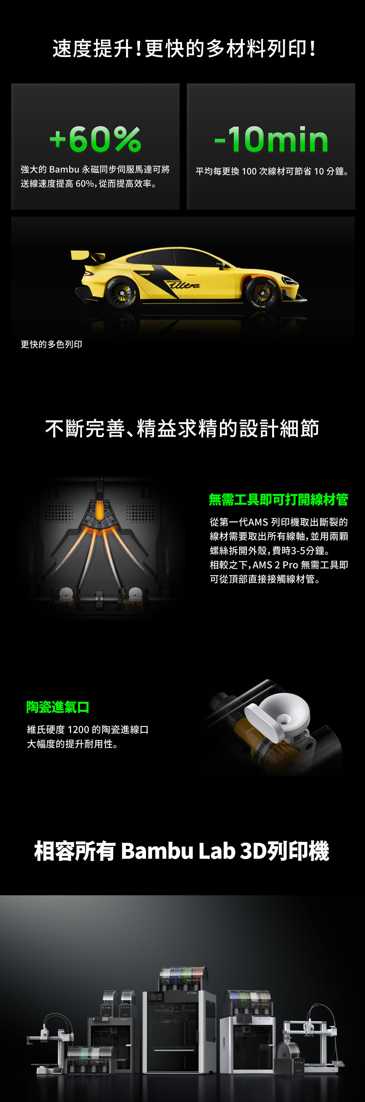 | 支持線材 | PLA、PETG、ABS、ASA、PET、PA、PC、PVA(乾燥)、BVOH(乾燥)、PP、POM、HIPS 和 Bambu PLA-CF/ PAHT-CF/ PETG-CF |