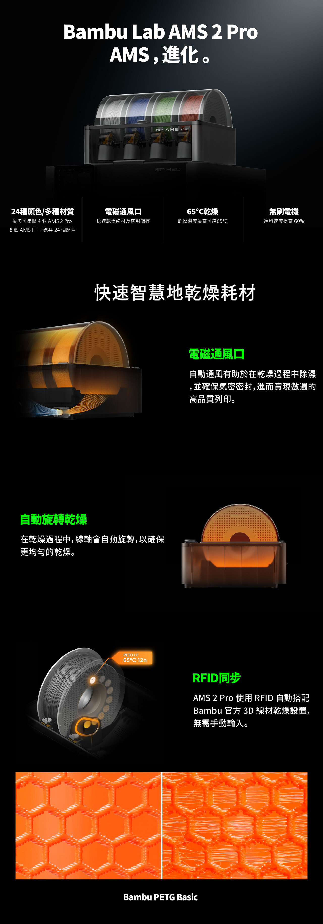 自動線材參數識別 Bambu Lab 原廠線材使用 RFID感測,AMS 可以讀取該 RFID,自動辨識並套用適合您材料的最佳設定。 |