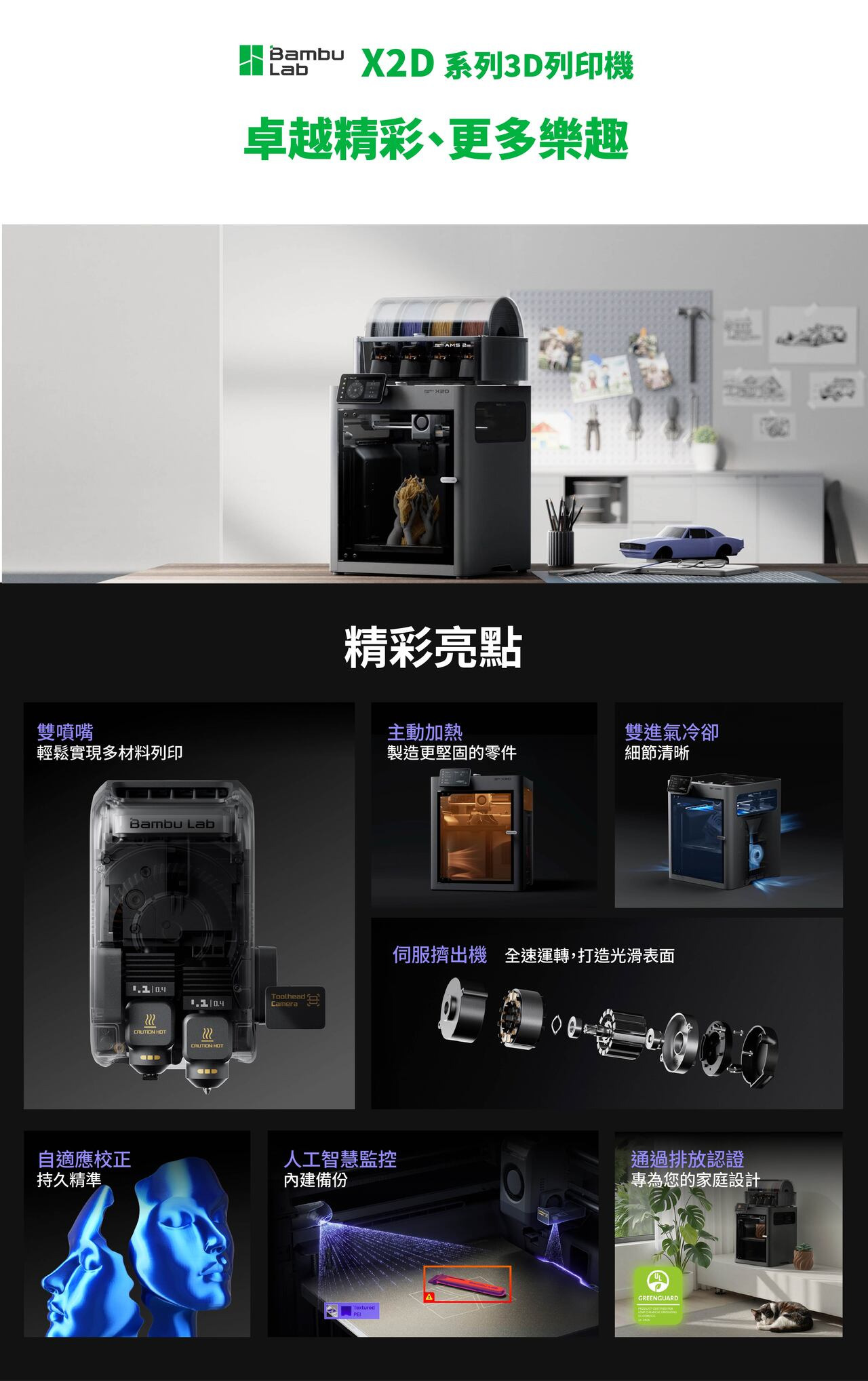 X2D 採用 300°C 的噴嘴和 65°C 的主動加熱艙體,足以滿足大多數工程材料所需溫度,主動加熱艙能均勻導熱,確保各層的材料之間牢固黏合。